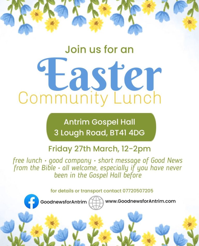 Looking forward to our Easter/Christmas COMMUNITY LUNCH in the Gospel Hall, 3 Lough Road, Antrim BT414 4PA on Friday 27th March, 12noon - 2pm.